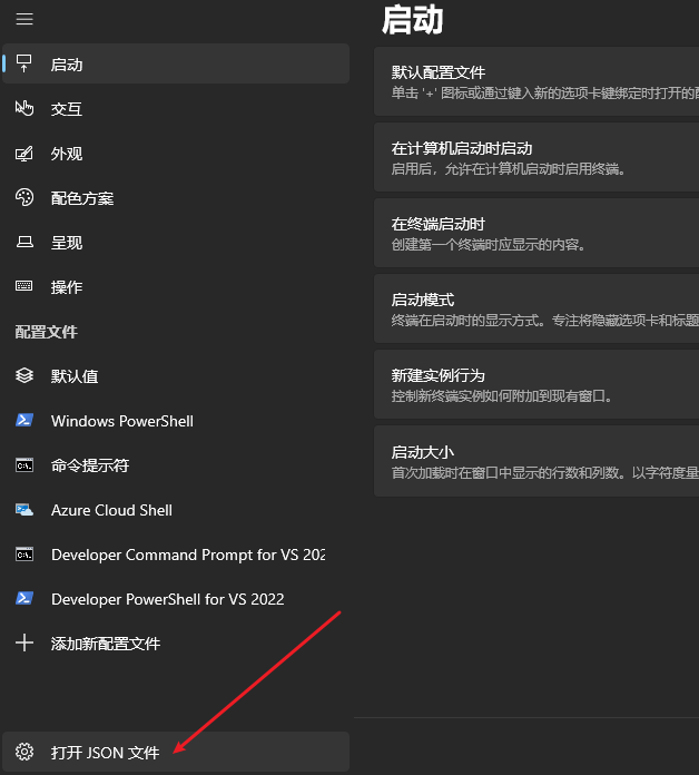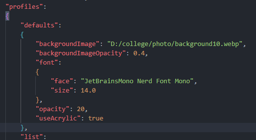 在wt(Windows Terminal)设置面板中打开json文件,然后找到defaults关键字并在后面花括号里追加以下代码: